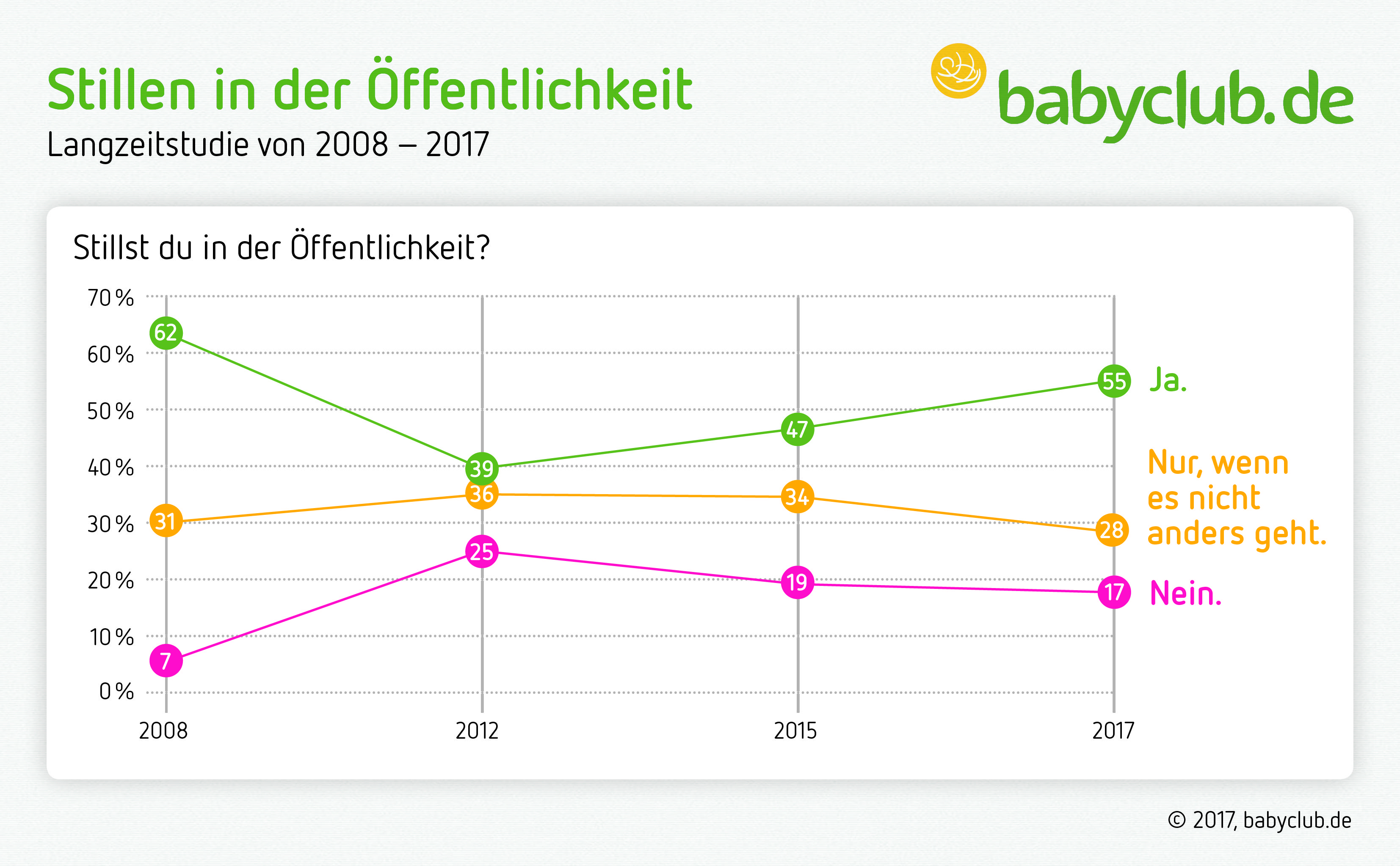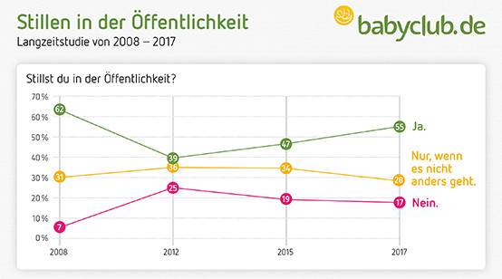 In der aktuellen Umfrage des Onlineportals babyclub.de sagten über die Hälfte der Stillenden, dass es ihnen nichts ausmache, in der Öffentlichkeit die Brust zu geben. Das sah vor fünf Jahren anders aus: 2012 waren es nur 39 Prozent, der Rest der Still-Mamis in Deutschland gab ihrem Baby nur dann öffentlich die Brust, wenn es nicht anders ging oder überhaupt nicht. Am unverkrampftesten gingen Mütter in 2008 mit dem öffentlichen Stillen um: 62 Prozent fanden es völlig in Ordnung. Heute sagt rund jede Dritte, dass sie nur dann vor den Augen anderer stillen würde, wenn es sich nicht vermeiden ließe und 17 Prozent sagen: „nein, die Blicke sind mir zu unangenehm.“