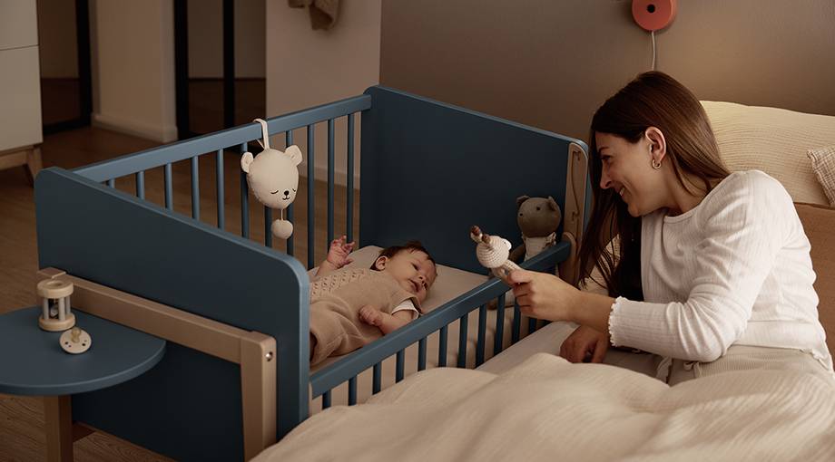 Little Cloud wird direkt am Elternbett fixiert und lässt sich an jede Höhe anpassen. Die Gitterseite lässt sich in vier Stufen öffnen und schließen – mit einer Hand. So schläft dein Baby sicher im eigenen Bereich, aber trotzdem ganz nah bei dir. Das erleichtert das nächtliche Beruhigen und Füttern und schafft ein gutes Gefühl für Eltern und Baby.