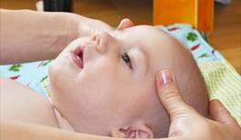 Zu Beginn beide Hände schützend und sanft um den Kopf legen und von der Kopfmitte aus zärtlich nach außen, hinter den Ohren entlang bis zum Kinn streichen. Das Baby genießt die Kopfmassage besonders, wenn es dabei unterhalten wird. Als nächstes mit den Fingern von der Stirnmitte nach außen zu den Schläfen, dann seitlich weiter bis zum Hinterkopf streichen. Zum Schluss will auch die empfindliche Augenpartie massiert werden. Dazu am besten die Linie der Augenbraue nachzeichnen und in leicht kreisenden Bewegungen an der Schläfe enden. Alle Übungen können mehrmals wiederholt werden.