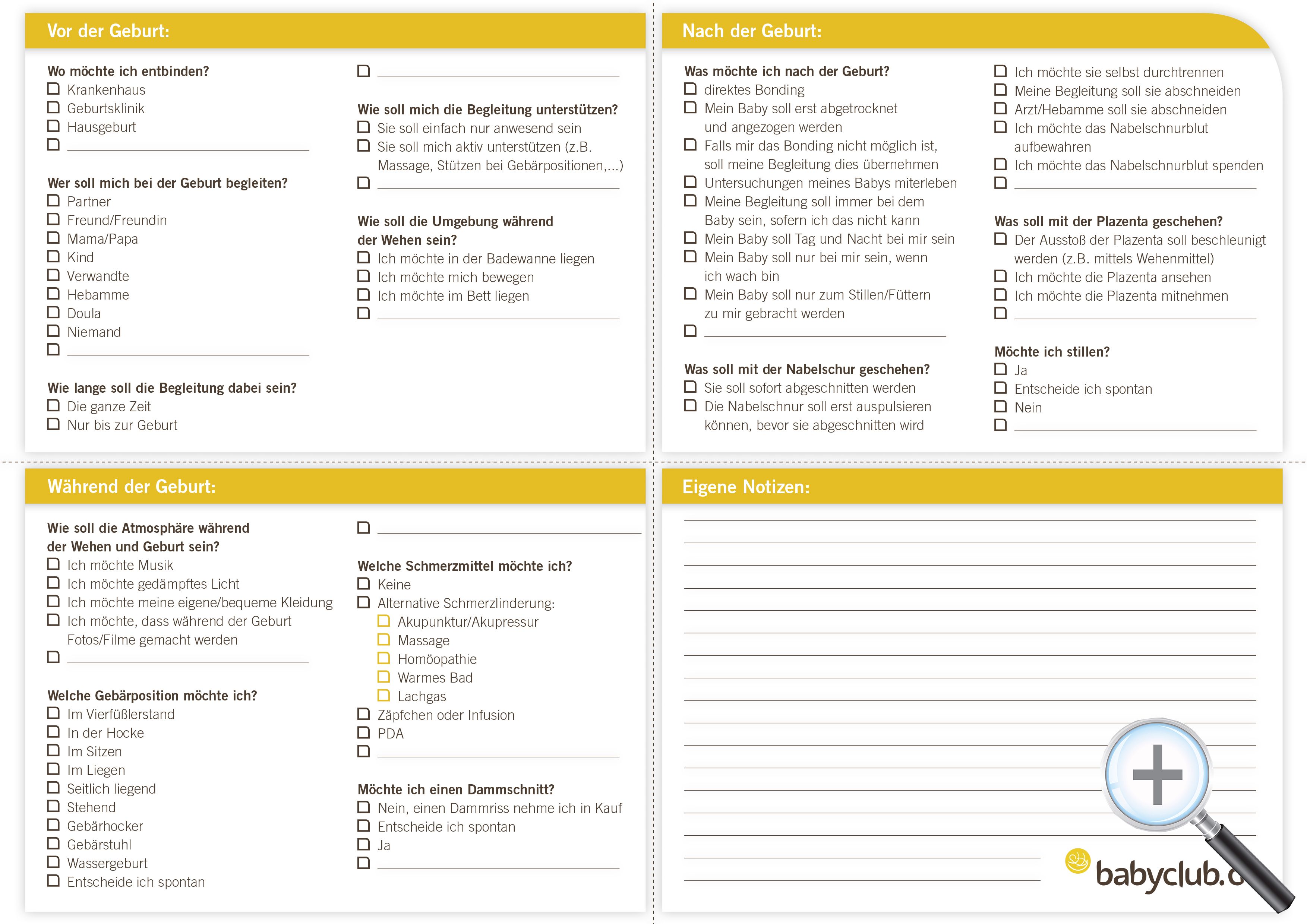 Ein Geburtsplan ist eine Art Wunschliste, in der die Schwangere festhält, wie sie sich die Geburt und die einzelnen Abläufe vorstellt. Der Geburtsplan kann als Checkliste angelegt sein oder auch als Brief verfasst werden. Manchmal bekommt ihr auch von eurer Hebamme einen Geburtsplan zur Verfügung gestellt, den ihr, wie unsere Checkliste, nur noch ankreuzen müsst.