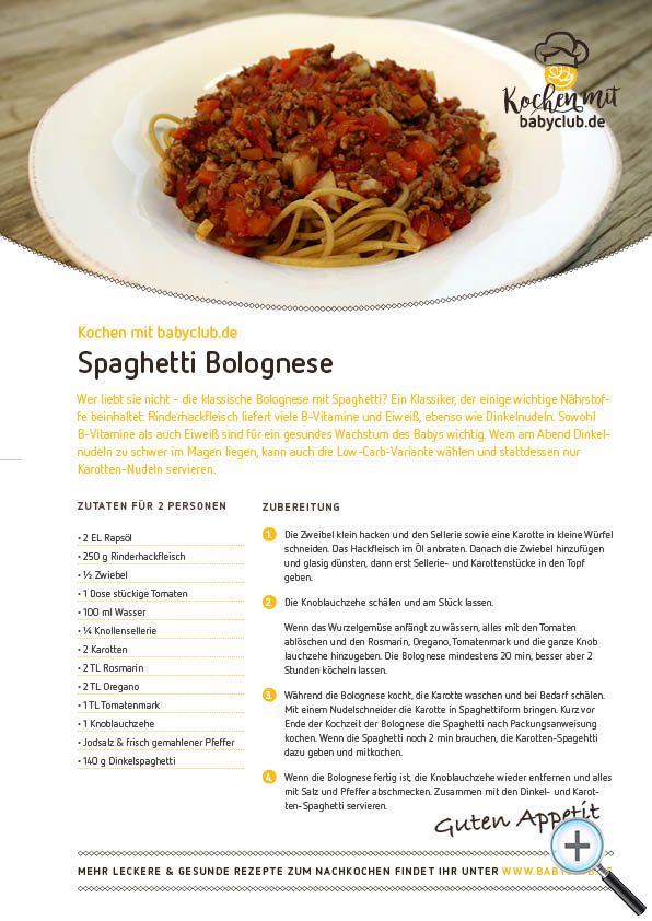Wer liebt sie nicht - die klassische Bolognese mit Spaghetti? Ein Klassiker, der einige wichtige Nährstoffe beinhaltet: Rinderhackfleisch liefert viel Eisen, B-Vitamine und Eiweiß. Sowohl B-Vitamine als auch Eiweiß sind für ein gesundes Wachstum des Babys wichtig. Wem am Abend Dinkelnudeln zu schwer im Magen liegen, kann auch die Low-Carb-Variante wählen und stattdessen nur Karotten-Nudeln servieren.