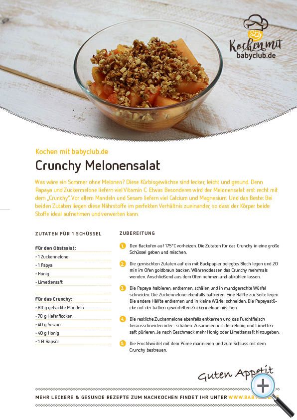 Was wäre ein Sommer ohne Melonen? Diese Kürbisgewächse sind lecker, leicht und gesund. Denn Papaya und Zuckermelone liefern viel Vitamin C. Etwas Besonderes wird der Melonensalat erst recht mit dem "Crunchy". Vor allem Mandeln und Sesam liefern viel Calcium und Magnesium. Und das Beste: Bei beiden Zutaten liegen diese Nährstoffe im perfekten Verhältnis zueinander, so dass der Körper beide Stoffe ideal aufnehmen und verwerten kann.
