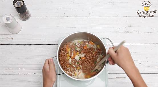 Ihr benötigt: Dinkel / 200g Kabeljaufilet / weiche Gemüsesorten