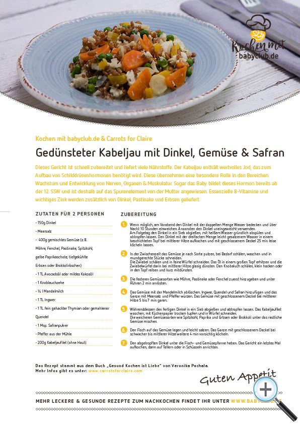 Dieses Gericht ist schnell zubereitet und versorgt euch und euer Baby mit vielen guten Nährstoffen. Der Kabeljau liefert nicht nur wichtige Omega-3-Fettsäuren, sondern auch wertvolles Jod, das zum Aufbau von Schilddrüsenhormonen benötigt wird. Diese wiederum übernehmen eine besondere Rolle in den Bereichen Wachstum und Entwicklung von Nerven, Organen und Muskulatur. Sogar das Baby bildet dieses Hormon bereits ab der 12. SSW und ist deshalb auf das Spurenelement von der Mutter angewiesen. Essenzielle B-Vitamine und wichtiges Zink werden zusätzlich von Dinkel, Pastinake und Erbsen geliefert.