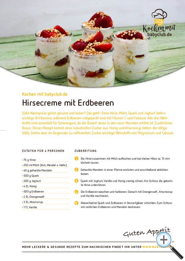 Süße Nachspeise gleich gesund und lecker? Das geht! Denn Hirse, Milch, Quark und Joghurt liefern wichtige B-Vitamine, während Erdbeeren vollgepackt sind mit Vitamin C und Folsäure. Alle drei Nährstoffe sind essentiell für Schwangere, da der Bedarf daran in den neun Monaten erhöht ist. Zusätzlicher Bonus: Dieses Rezept kommt ohne industriellen Zucker aus. Honig und Ahornsirup liefern die nötige Süße, bieten aber im Gegensatz zu raffiniertem Zucker wichtige Nährstoffe wie Magnesium und Calcium. Und wer saisonbedingt keine frischen Beeren bekommt, kann einfach tiefgekühlte Himbeeren nehmen.