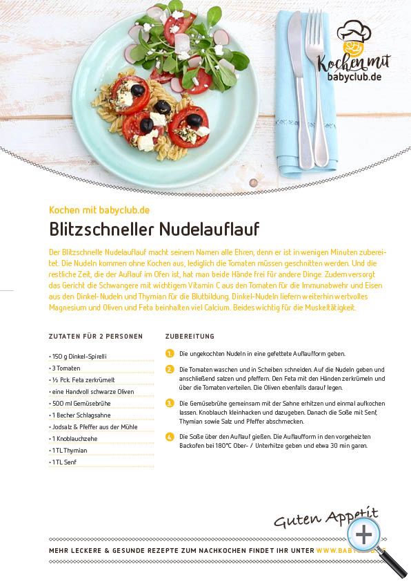 Der Blitzschnelle Nudelauflauf für Schwangere macht seinem Namen alle Ehren, denn er ist in wenigen Minuten zubereitet. Die Nudeln kommen ohne Kochen aus, lediglich die Tomaten müssen geschnitten werden. Und die restliche Zeit, die der Auflauf im Ofen ist, hat man beide Hände frei für andere Dinge. Zudem versorgt das Gericht die Schwangere mit wichtigem Vitamin C aus den Tomaten für die Immunabwehr und Eisen aus den Dinkel-Nudeln und Thymian für die Blutbildung. Dinkel-Nudeln liefern weiterhin wertvolles Magnesium und Oliven und Feta beinhalten viel Calcium. Beides wichtig für die Muskeltätigkeit.
