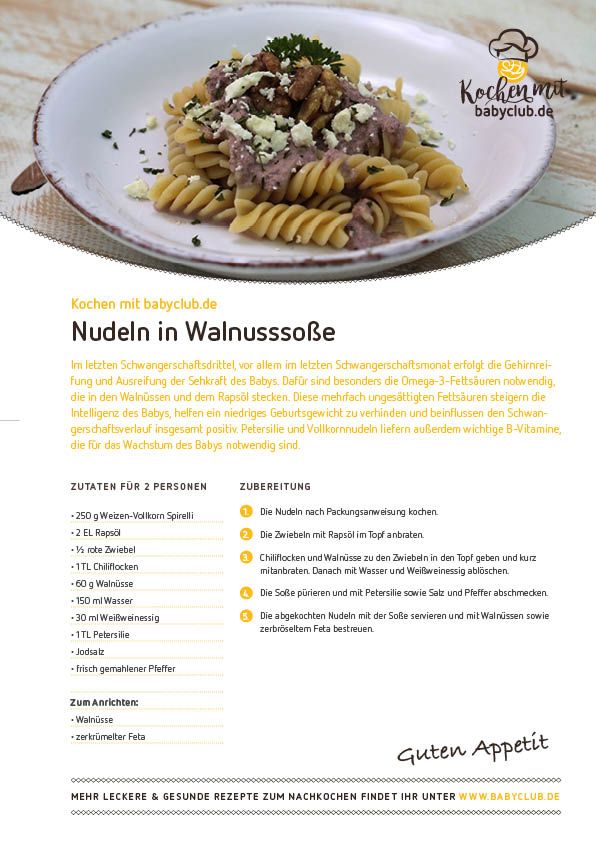 Im letzten Schwangerschaftsdrittel, vor allem im letzten Schwangerschaftsmonat erfolgt die Gehirnreifung und Ausreifung der Sehkraft des Babys. Dafür sind besonders die Omega-3-Fettsäuren notwendig, deren Vorstufe ALA in den Walnüssen und dem Rapsöl stecken. Diese mehrfach ungesättigten Fettsäuren steigern die Intelligenz des Babys, helfen ein niedriges Geburtsgewicht zu verhinden und beinflussen den Schwangerschaftsverlauf insgesamt positiv. Petersilie und Vollkornnudeln liefern außerdem wichtige B-Vitamine und Zink, welche für das Wachstum des Babys notwendig sind.