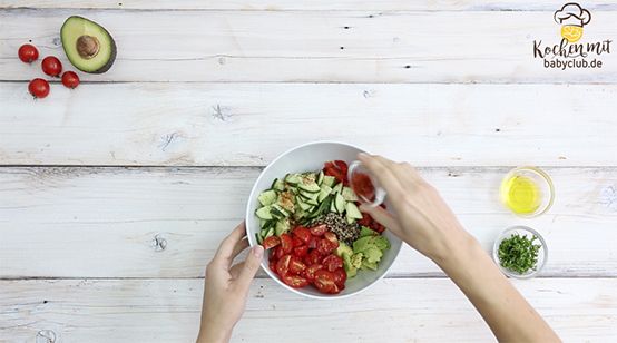 babyclub.de-Team Tipp: Dieser Salat eignet sich sowohl als Hauptgericht als auch als Beilage, z.B. beim Grillen. Wer es noch frischer mag, kann den Salat mit 2 EL Zitronensaft verfeinern.