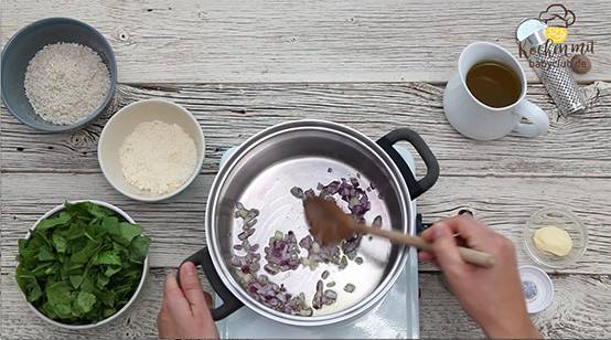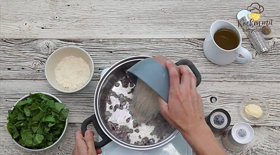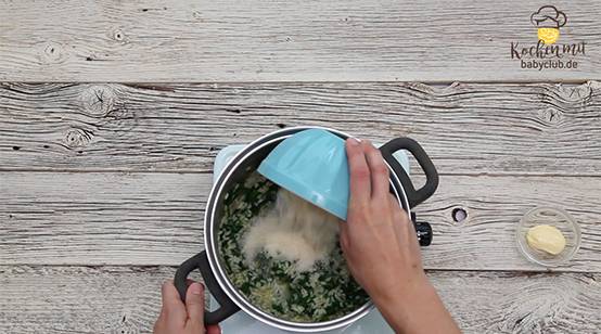 Danach den Risottoreis hinzufügen und ebenfalls glasig dünsten.