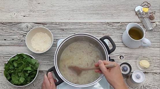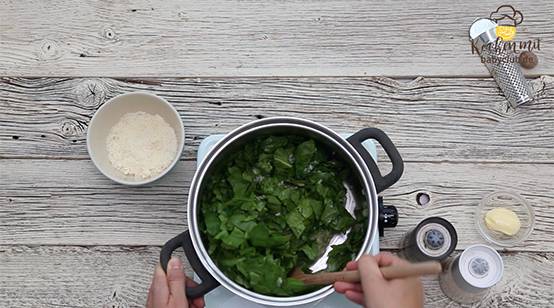 Den Blattspinat klein hacken und unterheben. Alles salzen, pfeffern und mit frisch geriebener Muskatnuss würzen.