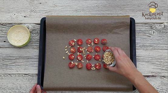 Ihr benötigt: eine Handvoll Kirschtomaten / 1 TL Thymian / 2 EL Pinienkerne / Parmesan