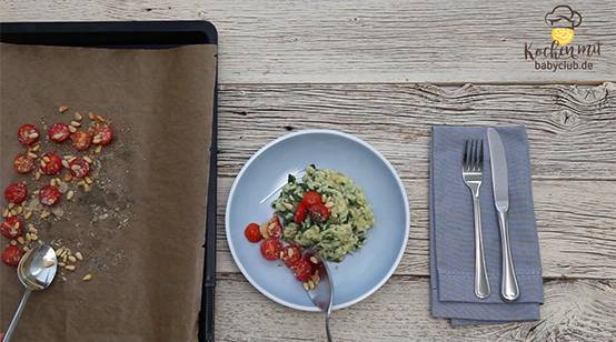 Das Spinatrisotto mit den gegrillten Tomaten anrichten.