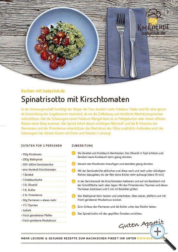In der Schwangerschaft benötigt der Körper der Frau deutlich mehr Folsäure, in diesem Rezent enthalten im Spinat. Folate sind für eine gesunde Entwicklung des Ungeborenen essenziell, da sie die Zellteilung und sämtliche Wachstumsprozesse unterstützen. Hat die Schwangere einen Folsäure-Mangel kann es zu Fehlgeburten oder einem offenen Rücken beim Baby kommen. Auch Magnesium und Kalium sind in Spinat enthalten und tragen u.a. zu einer guten Funktion von Nerven und Muskeln bei, sowie wertvolle Antioxidantien. In den Pinienkernen stecken Selen, gut für das Immunsystem, und wertvolle gesunde Fette.