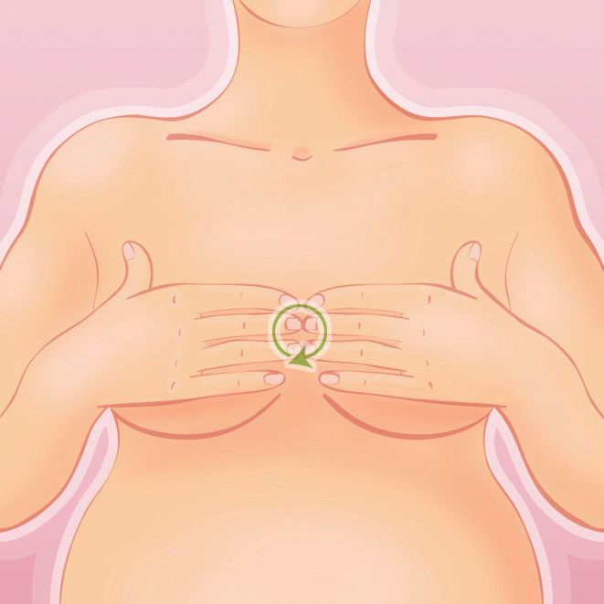 2. Die Arme überkreuzen und mit kreisenden Bewegungen die Lymphknoten stimulieren. Aber Achtung: bei einer Neigung zu vorzeitigen Wehen zu viel Reibung an den Brustwarzen vermeiden.