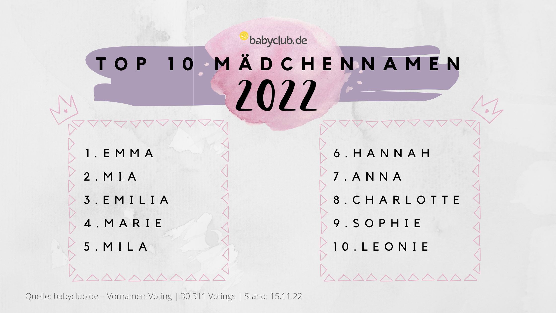 Findet hier weibliche Vornamen von A bis Z und die babyclub.de-Charts der beliebtesten Mädchennamen. Ob kurze oder lange Frauennamen, ausgefallene oder traditionelle – viel Spaß bei der Suche!